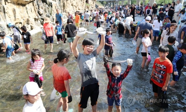 20일 오후 부산 동래구 온천천 인공폭포 일대에서 열린 물고기 잡기 체험행사에서 어린이들이 장어를 잡아 들어 보이고 있다. 동래구는 이번 행사를 위해 온천천에 장어 30마리와 미꾸라지 1만 마리를 방사했다
