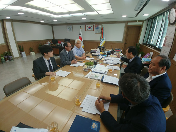 박윤국 경기 포천시장은 지난 20일 신임 코트라(KOTRA) 경기북부지원단장인 유승호씨를 접견하고, 유 단장에게 취임 축하인사를 전했다. 사진은 박 시장과 유 단장 등의 관계자들이 지역경제 현안 등에 대한 이야기를 나누고 있는 모습. (사진제공=포천시청)