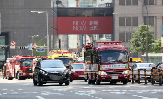 전국에서 소방차 길 터주기 훈련이 일제히 실시된 22일 서울 퇴계로 명동역 인근을 서울중부소방서 차량들이 줄 지어 이동하고 있다.