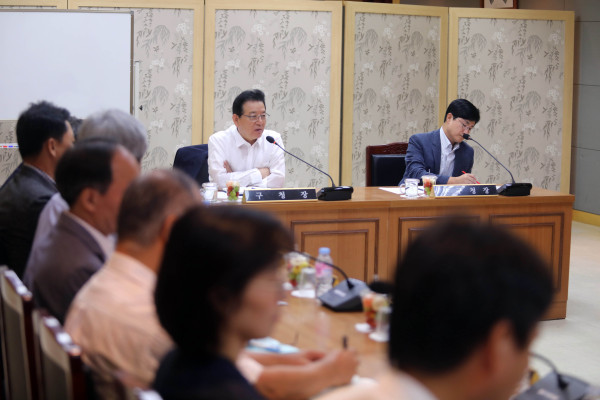 22일 정순균 강남구청장이 구청 본관 3층 대회의실에서 22개 전동 주민센터장과의 간담회를 열고 현장행정의 중요성을 강조하며, 주민센터 안팎을 비롯한 지역내 간선도로 등의 철저한 환경정비를 당부했다. 사진은 간담회 진행 모습. (사진제공=강남구청)
