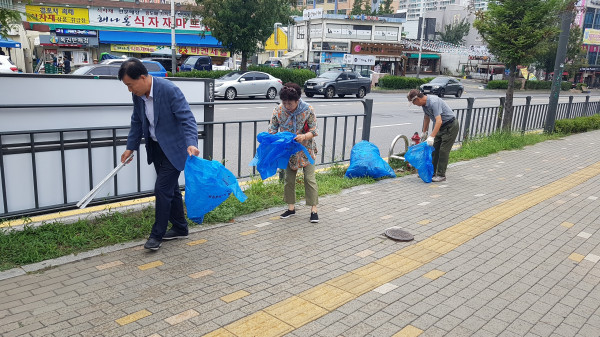 경기 김포시 풍무동은 23일 태풍 ‘솔릭’ 내습 전 지역내 환경정비를 위해 풍무동 통장단협의회와 풍무동 주요 일대 거리를 청소했다. 사진은 참여자들이 쓰레기를 수거하고 있는 모습.(사진제공=김포시청)