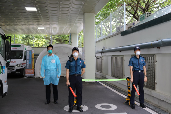 경기 부천시는 23일 순천향대학교부속 부천병원에서 민·관·경이 함께 참여하는 감염병 위기대응 모의훈련을 실시했다. 이번 훈련은 부천시보건소, 순천향대학교부속 부천병원, 부천원미경찰서가 합동으로 진행했다. 사진은 경찰관들이 환자 및 시민 통제 훈련을 진행하는 모습.(사진제공=부천시청)