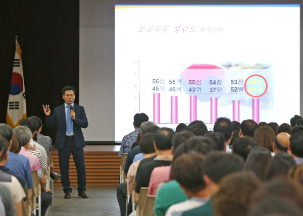 금천구는 최근 구청 대강당에서 반부패·청렴문화 정착을 위한 전직원 대상 청렴교육을 실시했다. 사진은 청렴교육 전문강사 김성완 교수가 청탁금지법, 개정된 공직자 행동강령, 공익신고 등에 대해 설명하는 모습.(사진제공=금천구청)