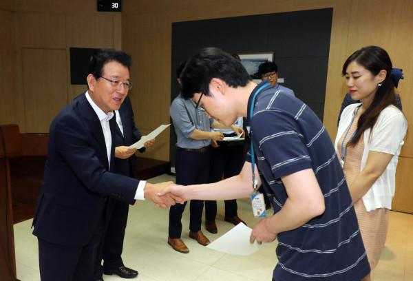 서울 강남구가 태풍 ‘솔릭’에 따른 비상체계 가동으로 당초 24일 예정됐던 하반기 인사 전보 임용장 수여식을 지난 23일 오후 4시로 앞당겨 진행했다. 사진은 정순균 구청장(왼쪽)이 인사 전보 임용장 수여식에서 임용장을 수여하고 악수를 하고 있는 모습.(사진제공=강남구청)