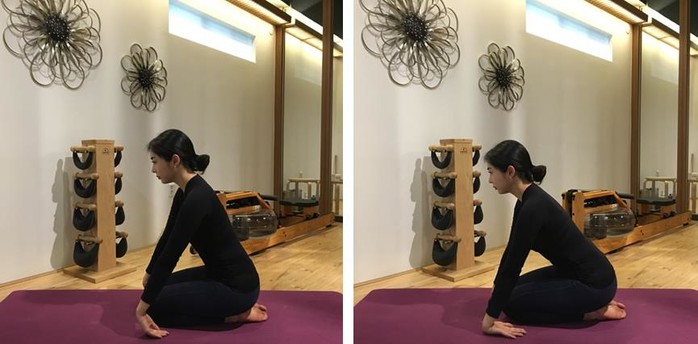 1) 무릎을 꿇고 앉습니다. 팔꿈치를 완전히 폅니다.