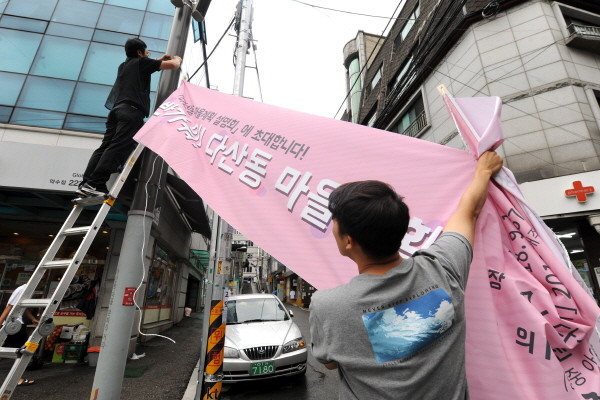 지난 24일 전국에 내려졌던 태풍 특보가 대부분 해제됨에 따라 중구 다산동주민센터 관계자들이 구정 홍보 현수막을 다시 내걸고 있다. 구는 지난 22일부터 태풍 피해를 최소화하기 위해 강풍에 취약한 현수막, 입간판, 광고물을 모두 제거했다.(사진제공=중구청)