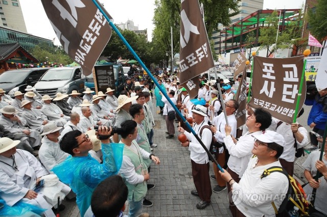 26일 오후 서울 조계사 앞에서 열린 '대국민 참회와 종단개혁을 위한 전국 승려 결의대회'에서 전국포교사연합 참가자들이 입구를 막은 조계사 관계자들 앞에서 목탁을 두드리고 있다.