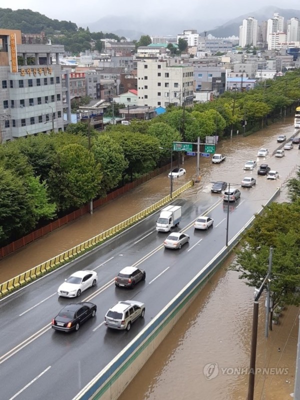 27일 오전 광주 남구 백운동 일대 도로가 시간당 60㎜ 이상 쏟아진 국지성 호우로 물에 잠겨 있다.