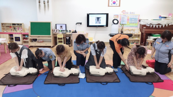 인천중부소방서는 최근 재능대학교 부속유치원을 방문해 교사 등 직원 20여명을 대상으로 ‘찾아가는 심폐소생술 교육’을 실시했다. 사진은 참여자들이 심폐소생술 실습을 하고 있는 모습. (사진제공=인천중부소방서)