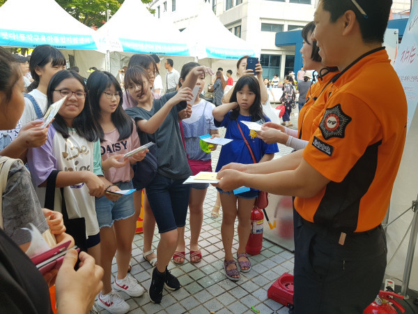 동작소방서는 지난 25일 숭실대학교에서 열린 동작복지나눔축제에서 ‘찾아가는 안전체험교실’을 운영했다. 사진은 이날 행사를 찾은 동작구 소재 한 초등학교 학생들이 소방안전부스를 방문해 ‘소방관 아저씨에게 편지 드리기’ 이벤트를 진행하는 모습. (사진제공=동작소방서)