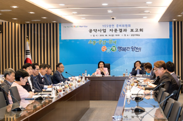 김수영 양천구청장(가운데)이 최근 양천구청 공감기획실에서 열린 'YES양천준비위원회 공약사업 자문결과 보고회'에 참석해 발언하고 있다. 구는 민선7기 공약사업의 체계적·효율적 추진을 목표로 출범한 YES양천 준비위원회의 한달여간 운영을 마치고, 자문 결과를 공유하고 사업 추진에 만전을 기하기 위해 보고회를 열었다. (사진제공=양천구청)