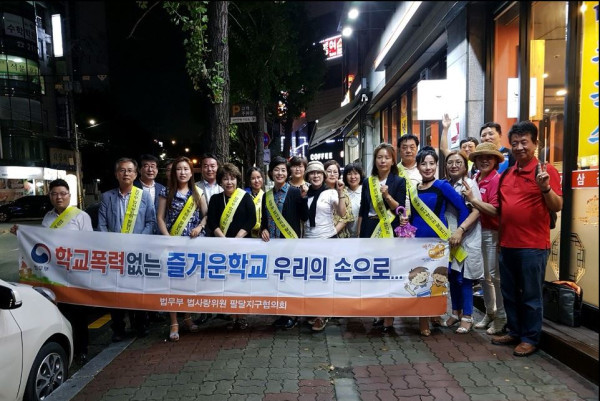 경기 수원시 팔달구는 27일 청소년 유해업소가 밀집해 있는 인계동 인근에서 법무부 법사랑위원 팔달구협의회 위원 20여명과 함께 청소년 선도 캠페인을 실시했다. 사진은 참여자들이 기념촬영을 하는 모습. (사진제공=수원시청)