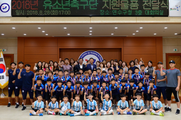 인천 연수구체육회는 28일 구청 대회의실에서 구청 유소년축구단과 인천 YSC 유소년축구단에 유니폼과 축구공 등의 용품을 전달했다. 이번 지원은 통한 지역유소년축구 활성화를 위한 사업의 일환으로 인천시체육회와 연수구체육회 주관으로 이뤄졌다. 사진은 관계자들이 기념촬영을 하는 모습. (사진제공=연수구청)