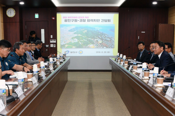 광진구와 광진경찰서가 28일 오전 11시 광진경찰서에서 ‘광진구청·광진경찰서 간부간담회’를 열었다. 이날 간담회에는 김선갑 구청장, 최익수 서장, 양 기관 간부 등 22명이 참석한 가운데 상견례 같은 분위기로 화기애애하게 진행됐다. 사진은 참여자들이 회의하고 있는 모습. (사진제공=광진구청)