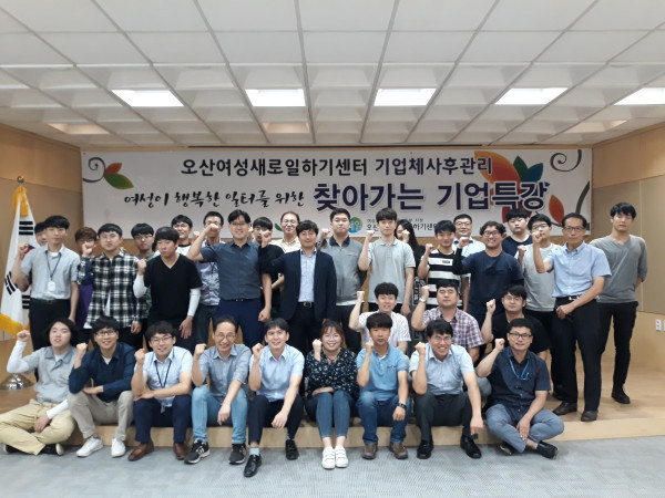 경기 오산고용복지플러스센터는 28일 센터 대회의실에서 진행된 ‘찾아가는 기업특강’의 일환으로 (주)트오에스 직원 45명을 대상으로 ‘리더십 교육’ 및 ‘직장내 성희롱 예방교육’을 진행했다. 사진은 교육에 참여한 관계자들이 기념촬영을 하는 모습. (사진제공=오산시청)