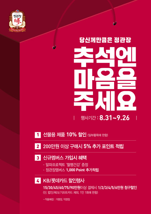 8월 31일부터 9월 26일까지 27일간 진행되는 이번 행사는 선물세트 브랜드 ‘다보록’ 23종을 비롯하여 홍삼톤골드, 홍삼달임액, 화애락, 알파프로젝트, 굿베이스 등 인기 제품 구매 시 다양한 구매 혜택을 제공한다.
