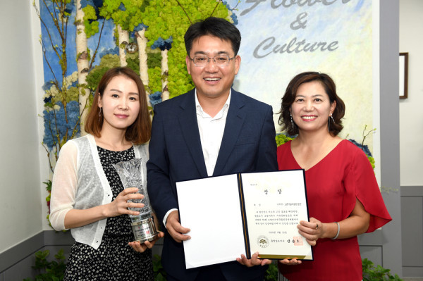 노원구립여성합창단이 지난 25일 충남 보령시 보령문화예술회관 대공연장에서 열린 ‘제2회 보령머드 전국합창경연대회’에서 대상을 수상했다. 사진은 오승록 구청장(가운데)과 합창단 관계자들이 상장을 들고 기념촬영을 하는 모습. (사진제공=노원구청)