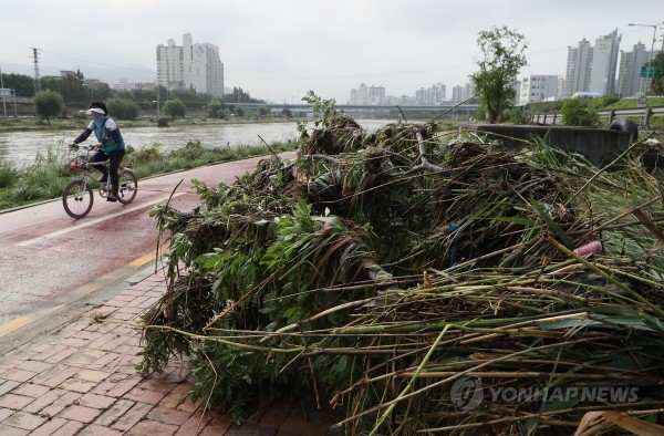 서울에 이틀 연속 쏟아진 폭우로 비 피해가 일어난 가운데 30일 오전 중랑천 산책로에 폭우로 쓰러진 나무와 나뭇가지들이 엉켜있다.