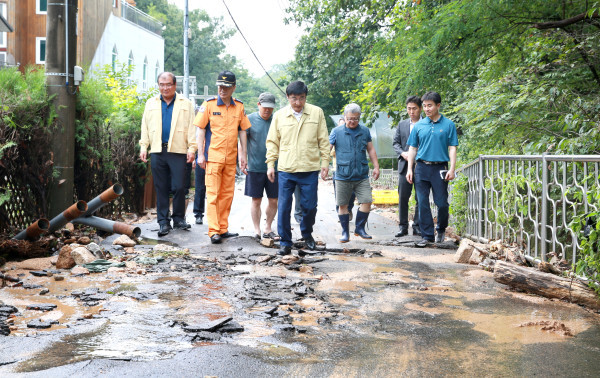 이동진 서울 도봉구청장은 30일 오전 최근 기습 폭우 발생으로 인해 피해를 본 현장을 구청 담당부서 직원들과 함께 순찰하면서 부서에 신속한 응급 복구에 총력을 다할 것을 지시했다. 사진은 폭우로 파손된 도로를 둘러보고 있는 이 구청장(가운데) 등 관계자들의 모습. (사진제공=도봉구청)