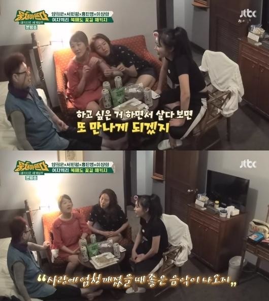 지난 26일 방송에서는 양희은, 서민정, 홍진영, 이상화의 북해도 패키지 2탄이 전파를 탔다. 이날 네 사람은 일정이 끝난 뒤 호텔방에 모여 맥주를 마시며 이야기를 나눴다.