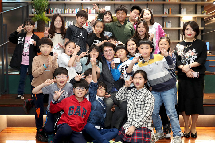 | ▲ 정원오 구청장이 '성동 책마루'를 방문한 경동초등학교 학생들과 기념활영을 하고 있다.(사진제공=성동구청) | ||