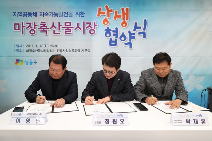 | ▲ 정원오 구청장이 '마장축산물시장 상생협약식'에 참석해 업무협약을 체결하고 있다.(사진제공=성동구청) | ||