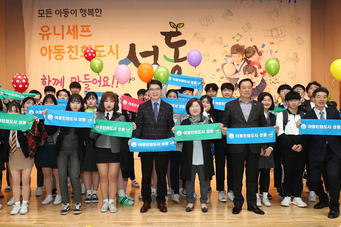 | ▲ 정원오 구청장이 '유니세프 아동친화도시 선포식'에 참석해 '아동친화도시 성동'이라고 적힌 플래카드를 들고 기념촬영을 하고 있다.(사진제공=성동구청) | ||