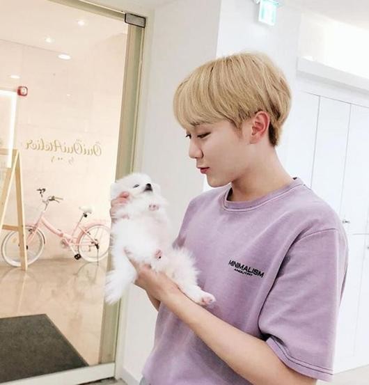 최근 승관은 자신의 SNS에 "위로 까꿍"이라는 글과 함께 한 장의 사진을 게재했다. 공개된 사진 속 승관은 양손을 이용해 강아지를 조심스레 안고 있다.