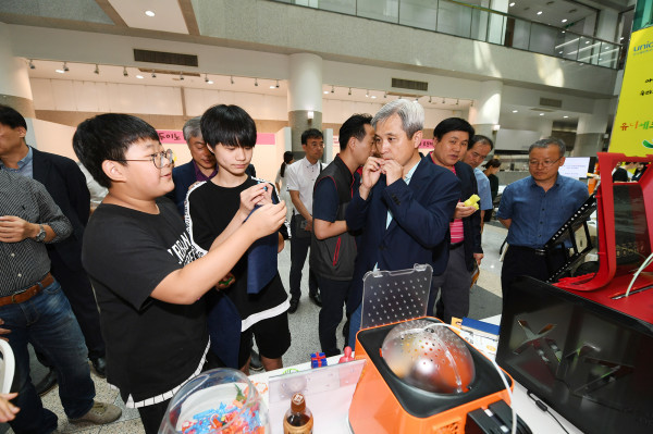 경기 오산시와 화성오산교육지원청이 주최하고, (재)오산교육재단과 오산시진로진학상담교사협의회가 주관한 ‘제1회 오산시진로진학박람회’가 지난 1일 오산시청에서 개최됐다. 사진은 진학박람회에 참석한 곽상욱 시장이 체험활동을 하는 모습. (사진제공=오산시청)