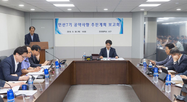 인천 서구는 최근 구 전체 간부공무원을 대상으로 ‘민선7기 공약사항 추진계획 보고회’를 열고, 총 5개 분야 45개 항목의 공약사항에 대한 준비 및 진행상황 검토, 향후 추진계획과 추진의 문제점 및 대책을 논의했다. 사진은 보고회의 진행 모습. (사진제공=인천 서구청)