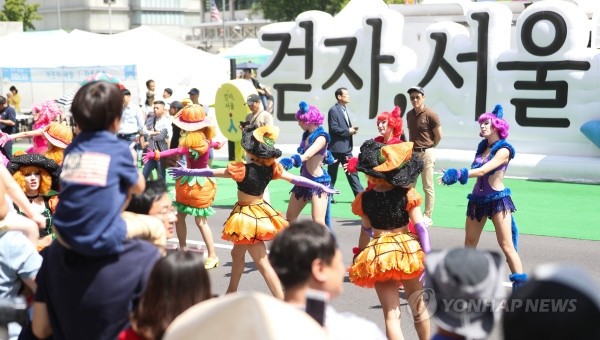 2일 서울 광화문 세종대로 보행전용거리에서 열린 로티스 할로윈 파티 퍼레이드에서 한 어린이가 아빠의 목말 위에서 퍼레이드를 관람하고 있다.