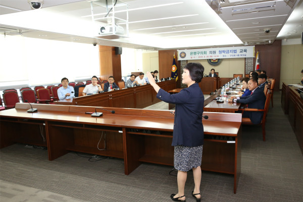 최근 서울 은평구의회가 행정복지위원회 회의실에서 청렴하고 공정한 공직문화를 선도하기 위해 일명 ‘김영란법’으로 불리는 청탁금지법 교육을 실시했다. 사진은 의원들이 이강숙 강사의 교육을 듣고 있는 모습. (사진제공=은평구의회)