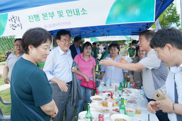 지난 1일 동대문구 용신동 주민센터가 동민의 화합과 단결을 위해 용두동 용두근린공원에서 ‘2018 용신동 어울림 한마당’을 개최했다. 사진은 행사에 참석한 유덕열 구청장(왼쪽 두 번째)이 구민들 함께 즐거운 시간을 보내고 있는 모습. (사진제공=동대문구청)