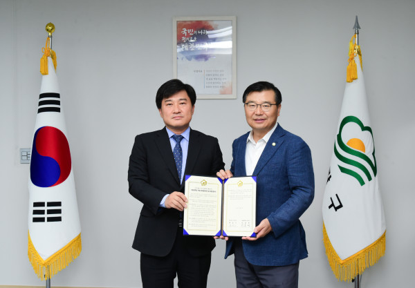 류경기 중랑구청장이 최근 구청장실에서 학교법인 세방학원과 민간이었던 서일대학교 부설 어린이집을 국공립어린이집으로 전환하는 협약을 체결했다. 사진은 류 구청장(오른쪽)이 협약서를 들고 기념촬영을 하는 모습. (사진제공=중랑구청)