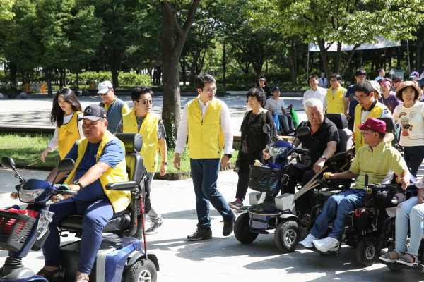 정원오 서울 성동구청장은 4일 오후 2시 서울숲 야외무대에서 성동구장애인체육회 주관으로 진행된 '2018 성동구 장애인 어울림 걷기대회'에 참석했다. 사진은 참석자들과 함께 서울숲 일원을 행진하고 있는 정 구청장의 모습. (사진제공=성동구청)