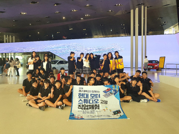 경기 남양주시 진접오남행정복지센터는 오는 10월11일까지 지역내 5개 중학교 190명을 대상으로 자동차산업 관련 진로체험활동을 진행한다. 사진은 5일 현대모터스튜디오 고양을 방문한 청소년들이 기념촬영을 하는 모습. (사진제공=남양주시청)