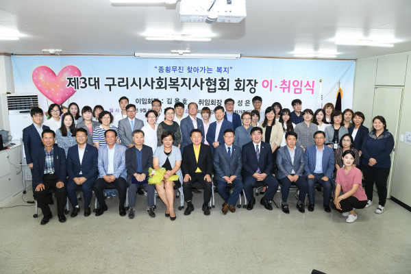 경기 구리시 사회복지사협회는 5일 구리시 건강가정·다문화가족지원센터 대강의실에서 '제3회 협회장'으로 선출된 윤성은 회장의 취임식을 개최했다. 사진은 취임식에 참석한 안승남 시장 등 관계자들이 기념촬영을 하는 모습. (사진제공=구리시청)