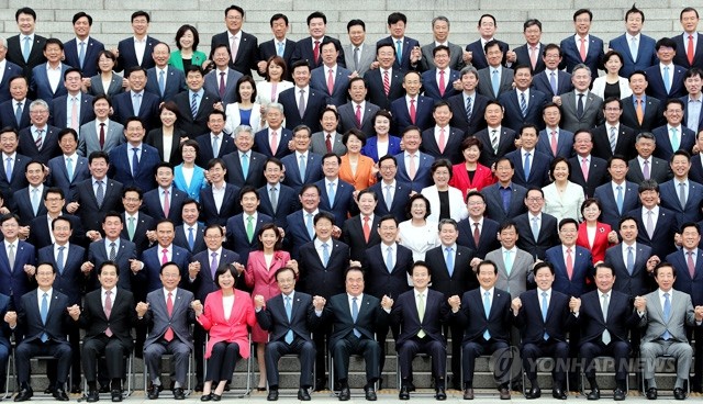 문희상 국회의장을 비롯한 국회의원들이 6일 국회 본청 앞에서 제헌 70주년 기념 단체사진을 촬영하고 있다.