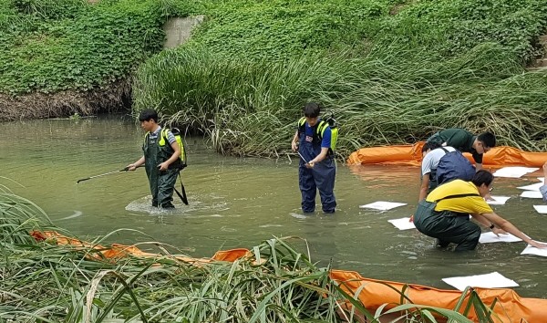 인천 계양구는 하천의 유류유출로 인한 하천 오염사고에 대비하기 위해 지난 6일 부평구 삼산동 굴포천에서 부평구와 합동으로 가상 방제훈련을 실시했다. 사진은 참여자들이 흡착포 및 액상 유처리제 살포 등 각종 방제장비를 이용한 초동 방제조치 훈련을 하고 있는 모습.(사진제공=계양구청)