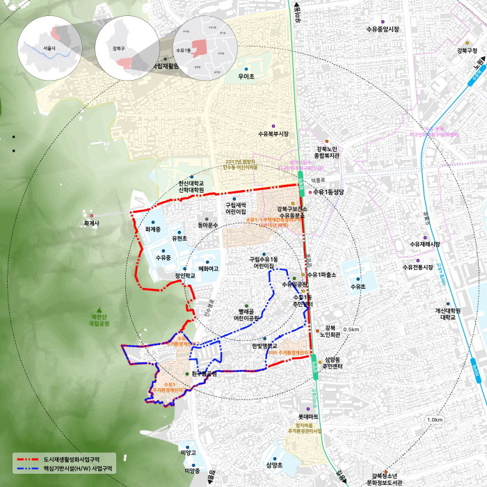 구에 따르면 이번에 선정된 사업의 정식 명칭은 ‘함께사는 수유1동 도시재생활성화사업’이다. 사업대상지인 수유1동(삼양동 일부 포함)은 최고 고도지구, 자연경관지구 등 도시계획의 여러 제약 탓에 개발과 정비가 어려운 지역으로 꼽힌다.