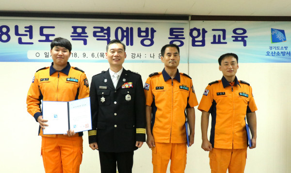 경기 오산소방서가 119구조대 류대현·정경호·안종균·장동욱 대원 등 4명을 '라이프세이버'로 선정했다. 사진은 박기완 서장(왼쪽에서 두 번째)을 비롯해 라이프세이버 선정자들이 기념촬영을 하는 모습. (사진제공=오산소방서)