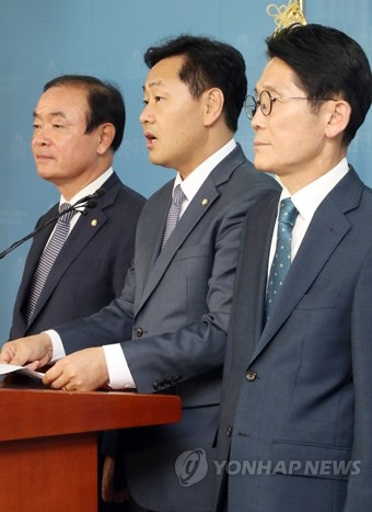 바른미래당 김관영(가운데), 민주평화당 장병완(왼쪽), 정의당 윤소하 원내대표가 11일 국회 정론관에서 정치개혁특별위원회의 정상화를 촉구하는 내용의 기자회견을 하고 있다.