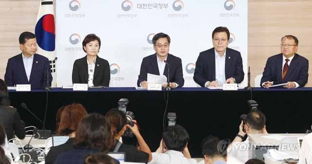 김동연 경제부총리 겸 기획재정부장관이 13일 오후 서울 세종로 정부서울청사에서 ‘주택시장 안정방안’을 발표하고 있다. 왼쪽부터 심보균 행정안전부 차관, 김현미 국토교통부 장관, 김동연 부총리, 최종구 금융위원장, 한승희 국세청장.