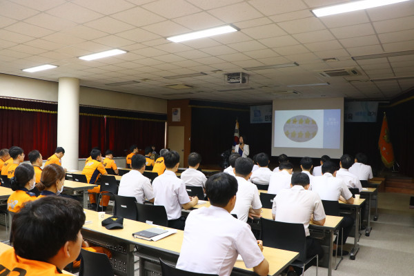 경기 하남소방서는 지난 14일 오전 소방서 3층 대회의실에서 전직원이 참석한 가운데 ‘민원응대 및 친절마인드 향상교육’을 실시했다. 사진은 강사가 ▲민원창구에서 방문민원 응대요령 ▲상황별 전화 응대요령 등에 대해 설명하는 모습. (사진제공=하남소방서)
