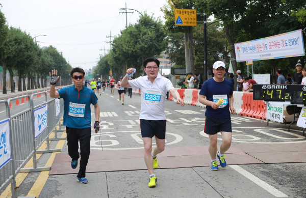16일 이정훈 서울 강동구청장이 암사동 선사유적지에서 열린 ‘2018 선사마라톤축제에 참가선수로 참여해, 행사 참여 주민들과 함께 마라톤을 실시했다. 사진은 골을 통과하고 있는 이 구청장(가운데)의 모습. (사진제공=강동구청)