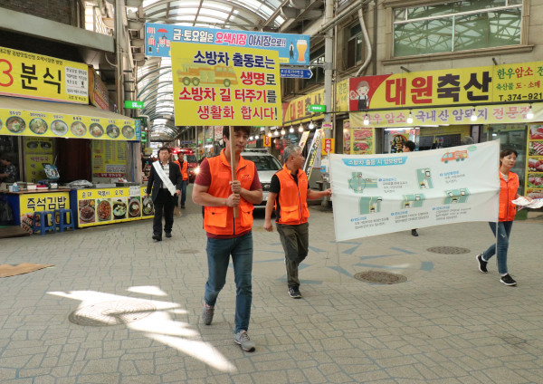 경기 오산소방서는 17일 오전 오산시내와 오산오색시장 일원에서 ‘9월 유관기관 합동 소방차 길터주기 훈련 및 캠페인’을 진행했다. 사진은 훈련 및 캠페인에 참석한 소방관들이 피켓을 들고 시장 일원을 행진하는 모습. (사진제공=오산소방서)
