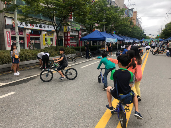 경기 수원시 권선구 곡선동은 지난 15일 수원축산농협 곡반정지점 거리에서 생태교통수단 이용문화 확산을 위한 2018년 제2회 곡선동 '자동차 없는 날' 행사를 개최했다. 사진은 어린이들이 자전거를 타고 있는 모습. (사진제공=권선구청)