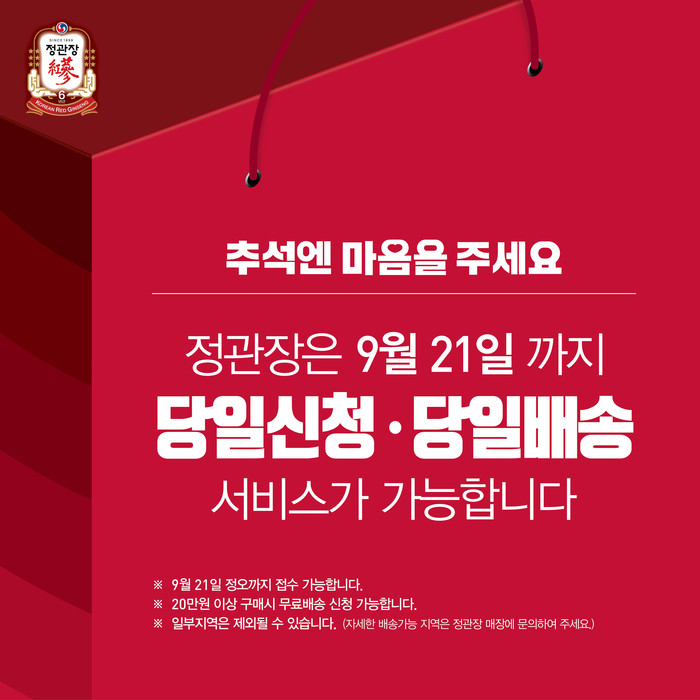 정관장 ‘당일신청·당일배송’ 서비스를 희망하는 고객들은 9월 21일 정오까지 전국 정관장 매장에서 배송 가능 지역 여부를 확인 후 신청하면 된다. ‘당일신청·당일배송’ 서비스는 전국의 정관장 매장에서 신청이 가능하며, 20만원 이상 구매 고객에게는 무료로 서비스를 제공한다.