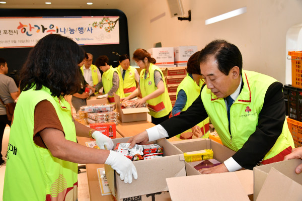 경기 포천시는 18일 경기사회복지공동모금회 북부사업본부 주관으로 추석명절을 맞이해 포천종합사회복지관에서 '한가위 나눔 행사'를 진행했다. 사진은 행사에 참석한 박윤국 시장(오른쪽) 등의 관계자들이 선물꾸러미를 만드는 모습. (사진제공=포천시청)