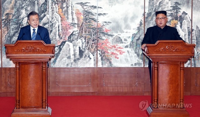 문재인 대통령과 김정은 국무위원장이 19일 백화원 영빈관에서 평양공동선언을 발표하고 있다. 양 정상은 군사적 적대관계 종식과 남북 비핵화 방안, 그리고 남북철도 및 도로 연결 착공식, 개성공단과 금강산관광 정상화 등에 합의했고, 김정은 위원장은 가급적 올해내 서울을 방문하기로 약속했다.